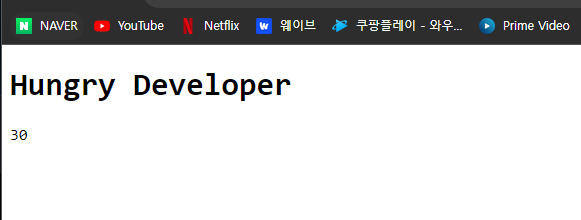 브라우저 화면에서 F12 → 콘솔을 눌러보면 위의 결과와 같이 30이라는 데이터가 콘솔화면에 출력된 걸 확인할 수 있다.