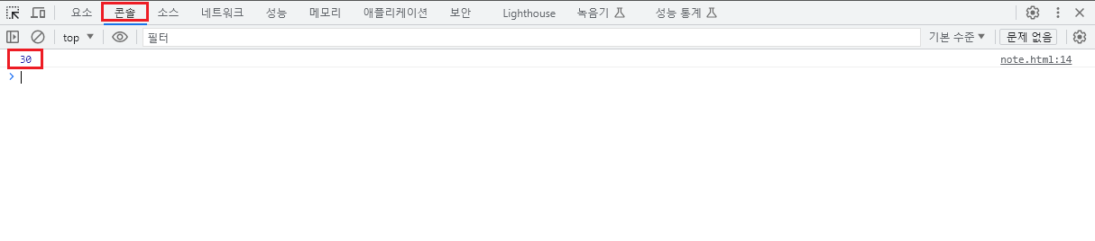 브라우저 화면에서 F12 → 콘솔을 눌러보면 위의 결과와 같이 30이라는 데이터가 콘솔화면에 출력된 걸 확인할 수 있다.